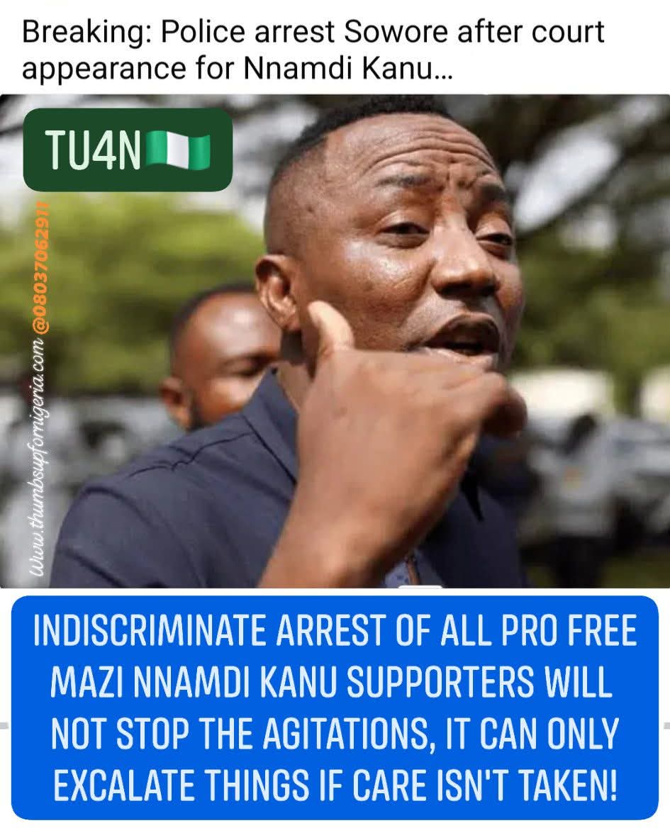 You can arrest them all for whatever it’s worth: Sowore, Kanu’s lawyer, his brother etc, but you cannot arrest the truth because it’s out there and Nigerians expect us to try Mazi Nnamdi Kanu since he’s fit to stand trial according to NMA report and let’s get over this tribal bigotry against an Igbo man!”- TU4Nš³š¬