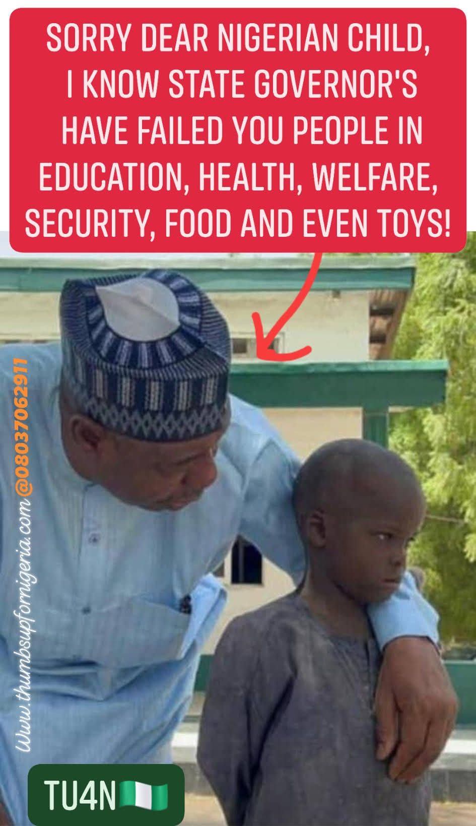 Guilty as charged Mr. Governor, the Nigerian child in your state is a victim under your stewardship and yet you collect billions in monthly allocations from the FG in trust for them with no initiatives to directly benefit them, yet it seems only your children matter!”-